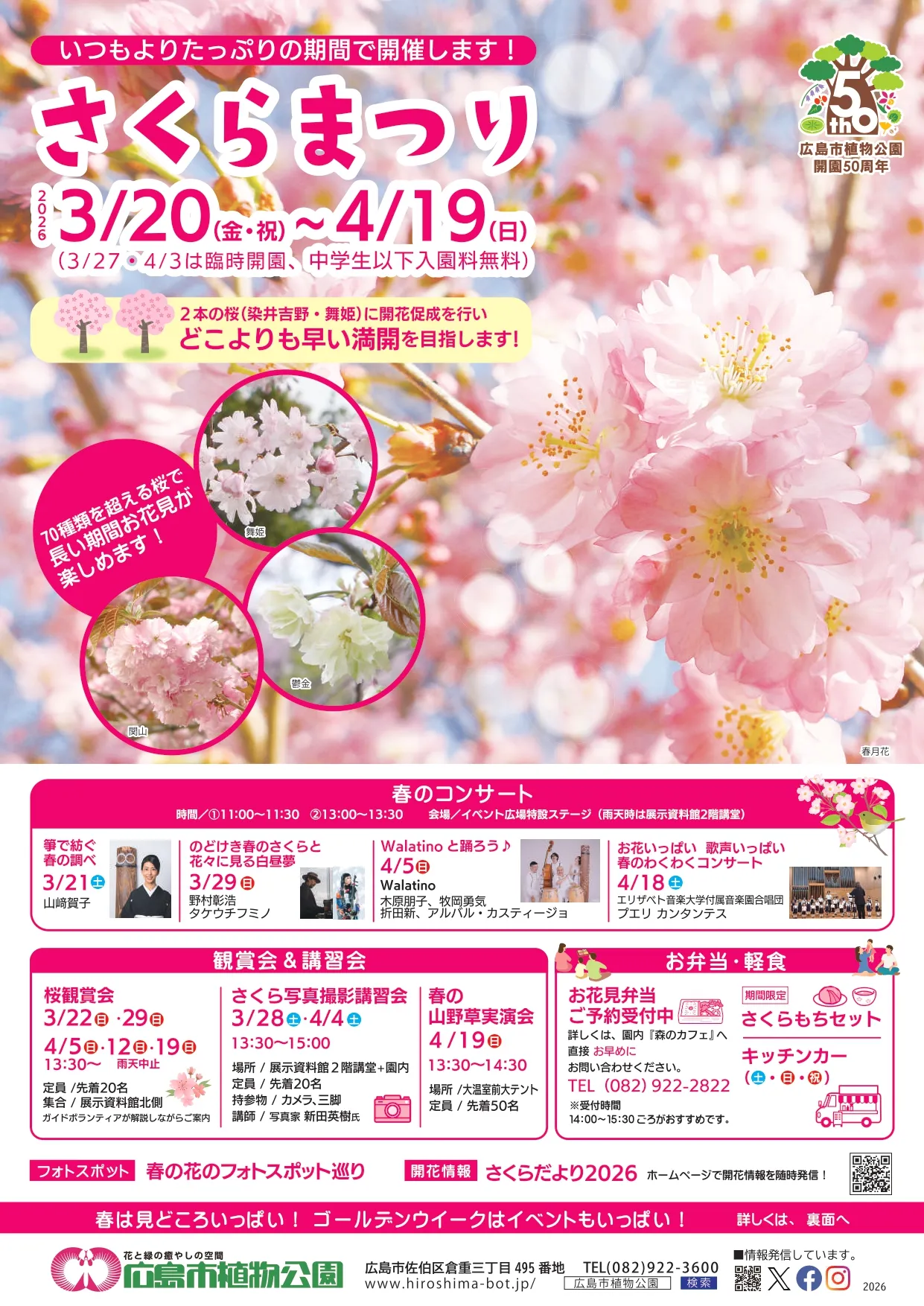 2026年3月20日(金・祝)から4月19日(日)まで、広島市植物公園で『さくらまつり』が開催されているみたいです。今年は開園50周年ということで、いつもよりたっぷりの期間で開催されるそう。園内では70種類を超える桜があり、長い期間お花見が楽しめるみたいです。3月27日(金)と4月3日(金)は臨時開園し、期間中は中学生以下の入園料が無料になるそうですよー。