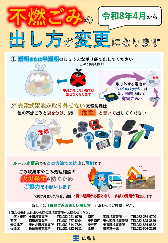 【要確認だ】4/1(水)から、広島市の『不燃ゴミ』の出し方が変更に。透明・半透明の袋が必須、充電式電池が含まれる家電は「危険」と記載が必要みたい。