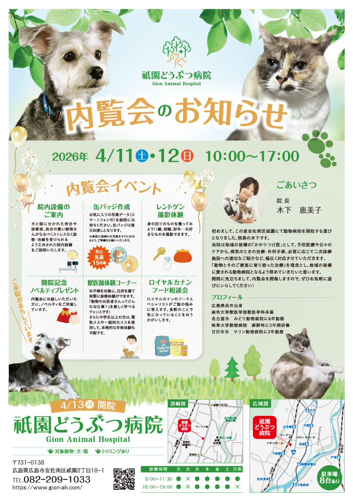 広島市安佐南区祇園に「祇園どうぶつ病院」が、2026年4/13(月)に開院するそうです。おめでとうございます!
