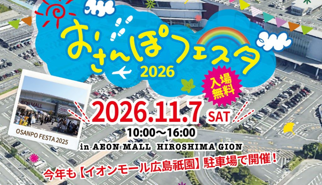 2026年11/7(土)10:00~16:00、広島市安佐南区祇園の「イオンモール広島祇園」駐車場で、昨年に引き続き、『おさんぽフェスタ2026 in イオンモール広島祇園』が開催されるそうです。