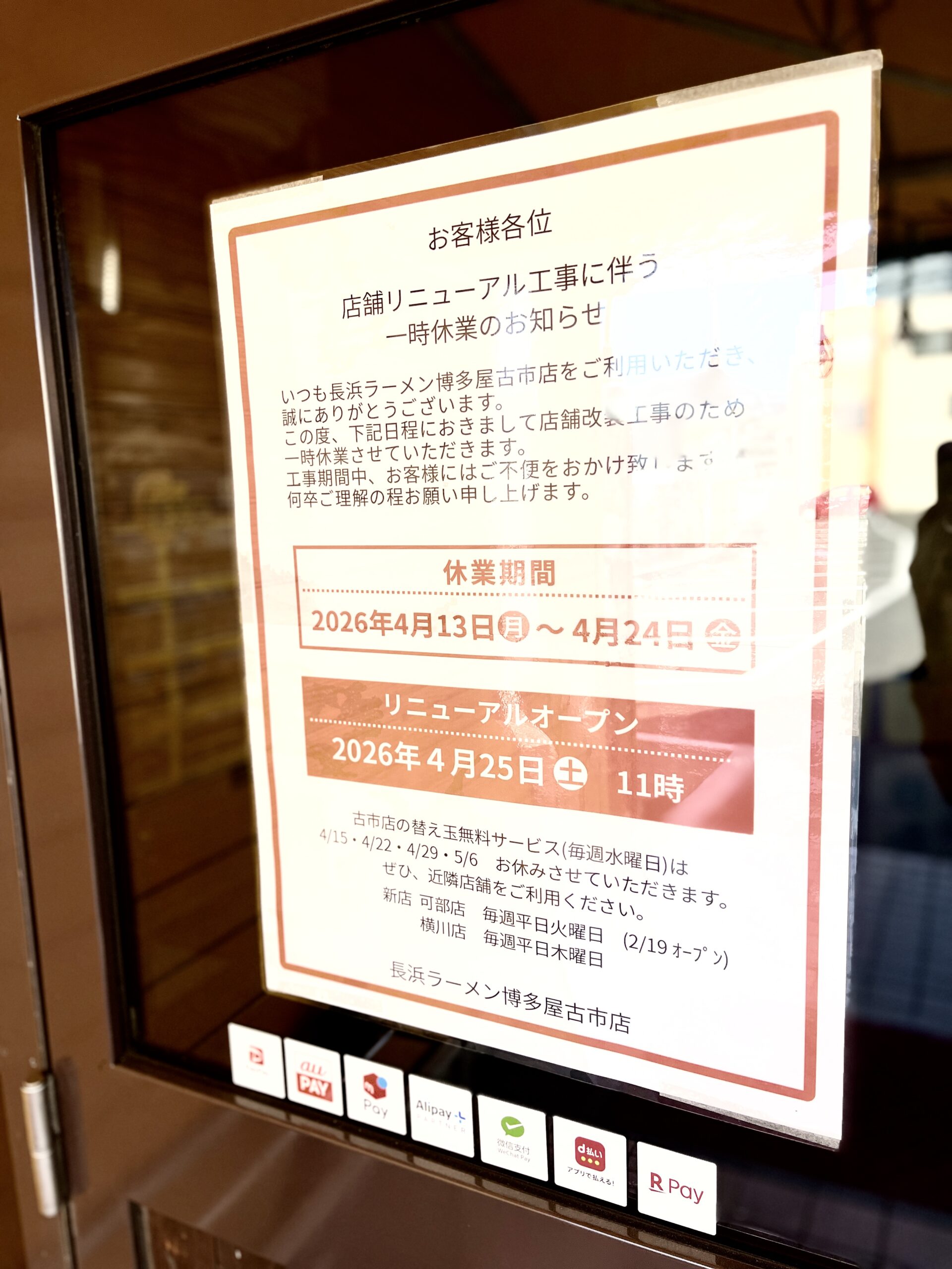 さて、その「長浜ラーメン博多屋 古市店」がリニューアル工事のため、一時休業するそうです。期間は2026年4/13(月)~24(金)です。