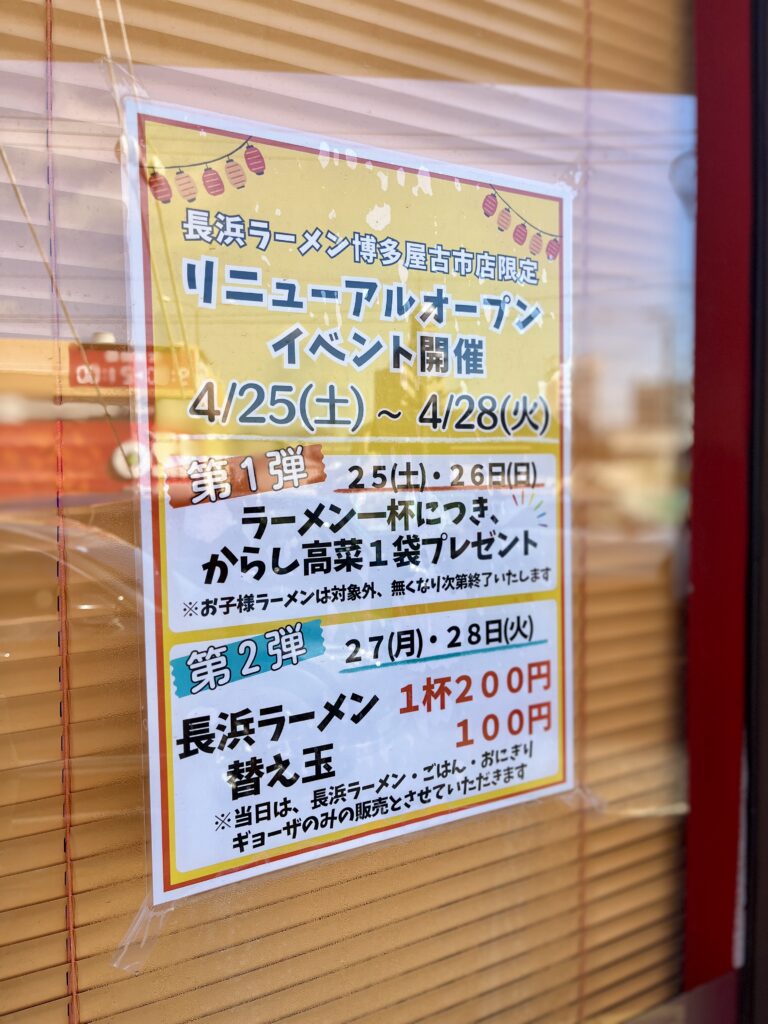ちょっといやらしい話、気になるのが「長浜ラーメン博多屋 古市店」のリニューアルオープンにあたってのキャンペーンについてです。探してみると・・・あったっっっ! 貼り紙を見つけました。