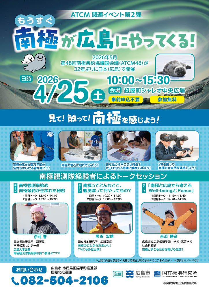今月25日に、5月の南極条約協議国会議開催記念イベント、「もうすぐ南極が広島にやってくる!~第2弾~」が紙屋町シャレオ中央広場にて開催予定です!