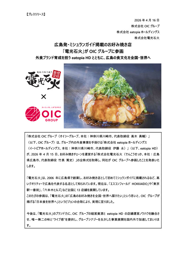 コチラはロピアを運営する株式会社OICグループのプレスリリースの資料です。広島の食文化広めるために、電光石火はグループインしたようです。