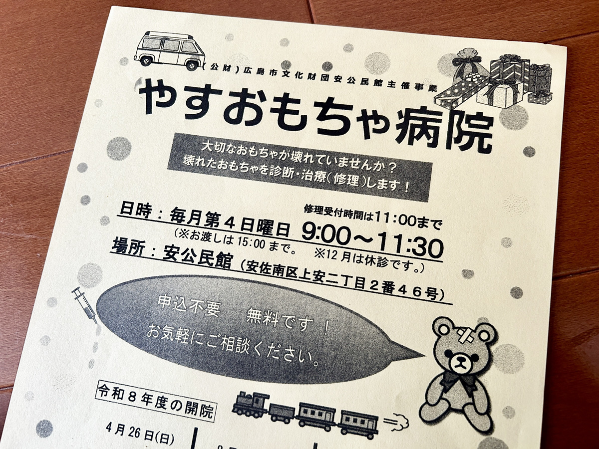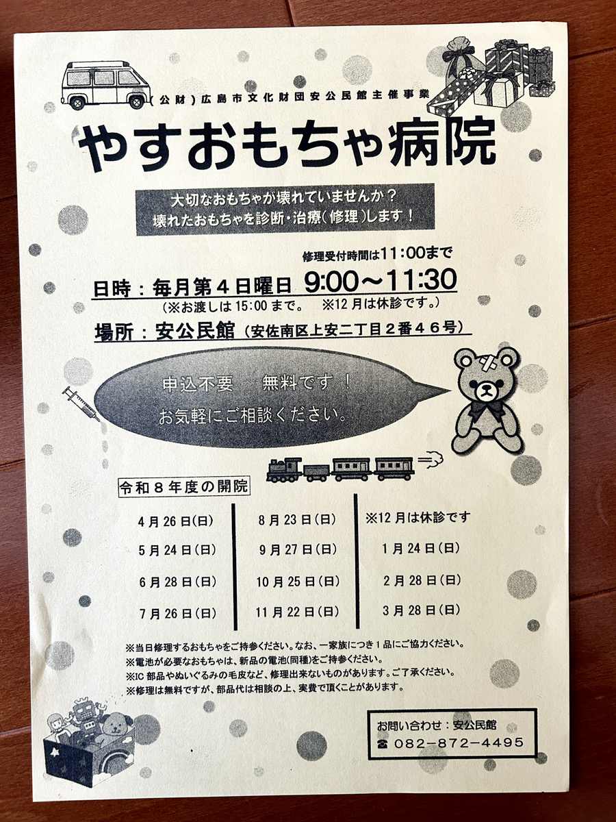 広島市安佐南区上安にある「安公民館」では、毎月第4日曜9:00~11:30(受付は11:00まで)、『やすおもちゃ病院』が開院しているようです。