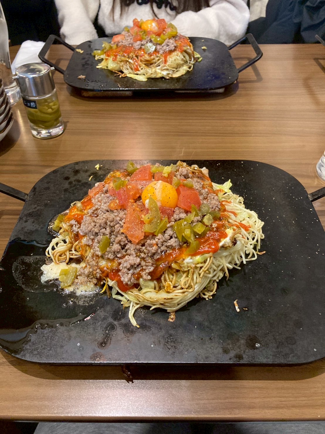 この『タコス風お好み焼き』は、秘伝ダシで仕上げた肉玉そばに、香ばしく焼いた合挽きミンチ、フレッシュハラペーニョ、トマトを重ねて、刺激的なチリソースでまとめた一品だそう。ダシの甘みとメキシカンスパイスの辛味が鉄板の上で融合する、新感覚の創作お好み焼きです!