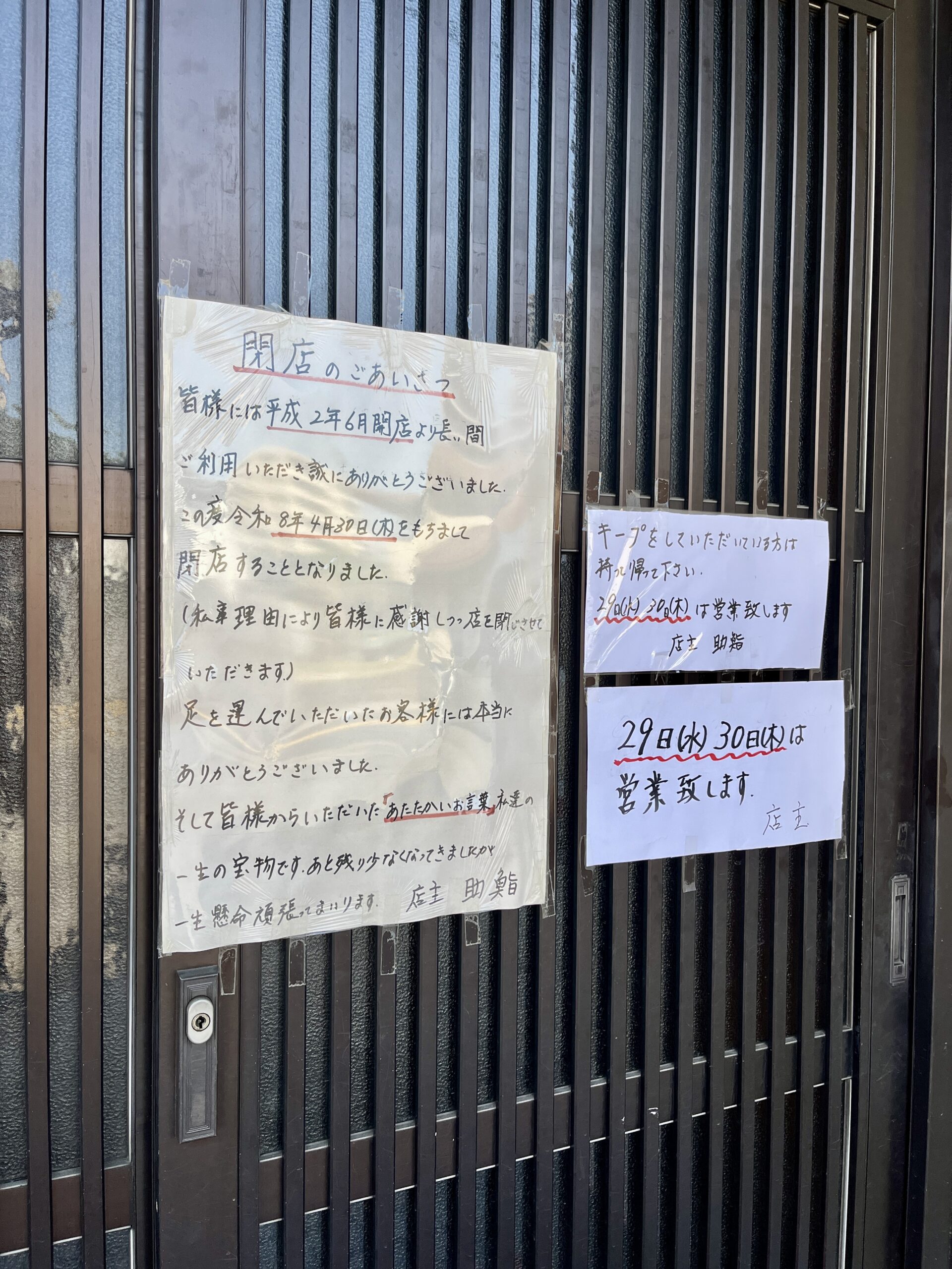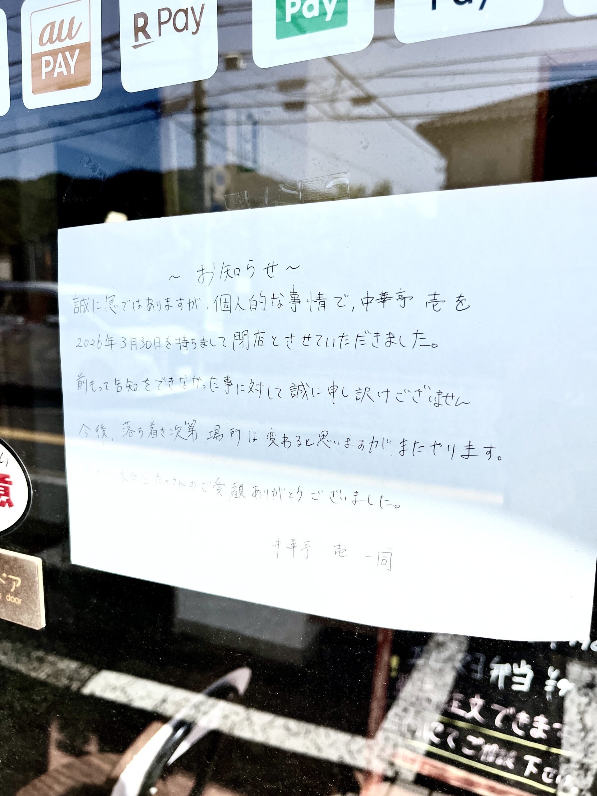 「こちらで紹介されていた中華料理屋さんの前を通りかかったところ、3/30に閉店されたと貼り紙がありました。内容としては、突然の閉店になってしまった、いつかまた帰ってきます、のようなことが書いてありました」