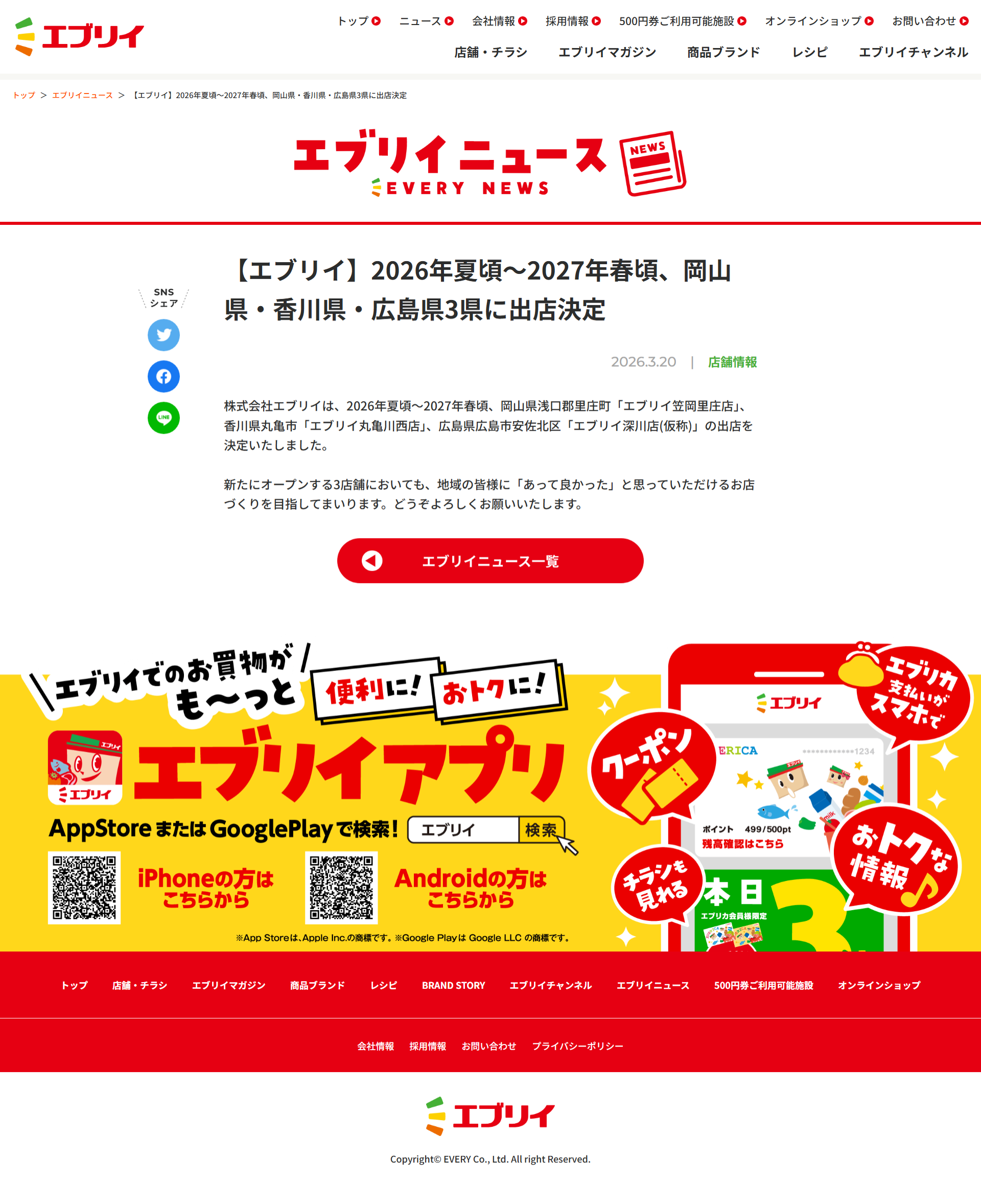 読者のぱんどえぴさんが送ってくれた情報の中に、「エブリイ」公式ホームページの出店情報がありました。2025年3/20にリリースされた情報です。見てみると、「エブリイ深川店(仮称)」という店名で、2026年夏頃~2027年春頃にオープンするようです。